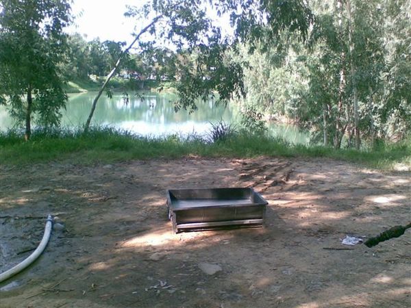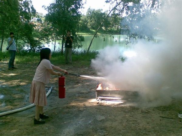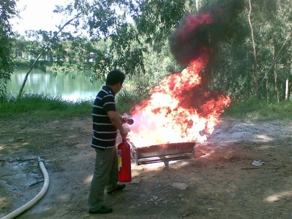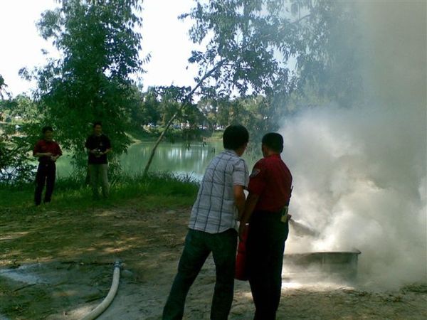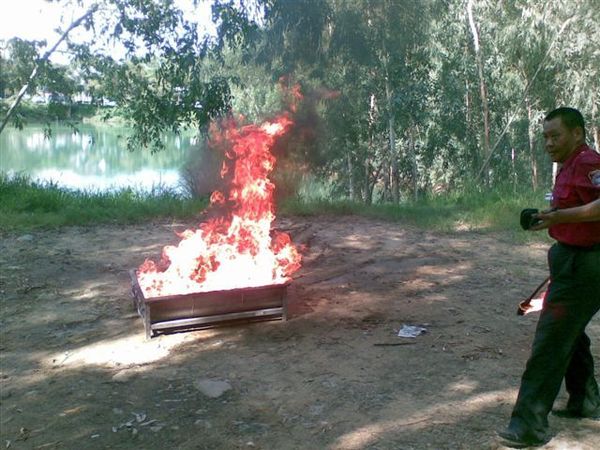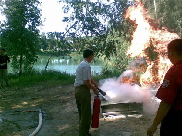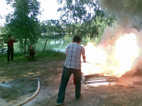 解說完,就要開始體驗。大哥在鐵桶裡淋上汽油,然後點火,馬上燃起熊熊大火。接著大家輪流上場滅火。(ㄟ~~~汽油現在很貴耶。)