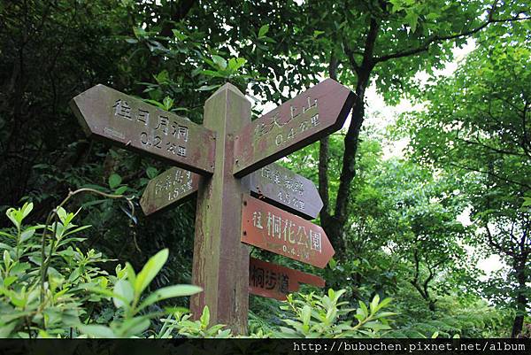 來到望月亭,這是個十字路口,往前通往天上山,往右通往日月洞,往左通往桐花公園,而後方是我來時走的路。